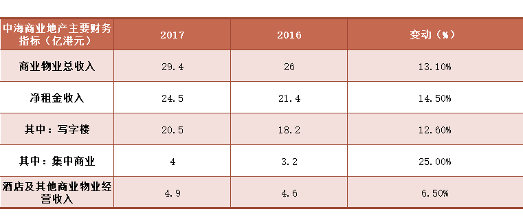 截至2017年12月31日,中海商业物业总收入近30亿港币,其中写字楼20.5亿港元,同比增长12.6%;集中商业4亿港元,同比增长25%。酒店及其他商业物业经营收入4.9亿港元,同比增长6.5%。