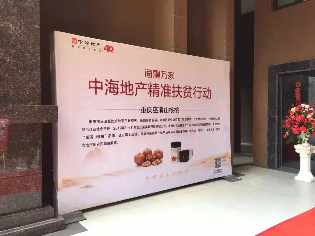 助力扶贫攻坚战,践行央企社会责任,2018年,中海地产经多轮考察和调研,选定巫溪县具有地理优势的农产品“山核桃”作为扶贫对象,为巫溪县免费创立了“巫溪山核桃”产品品牌,设计了极具巫溪县地域文化色彩的包装,建立网上店铺,同时实际采购产品,持续结合中海全国各公司在售楼盘、社区开展推广活动,发动中海广大业主成为其产品客户,帮助该产品打开市场销路,助力当地贫困农民脱贫致富,实现持续增收。