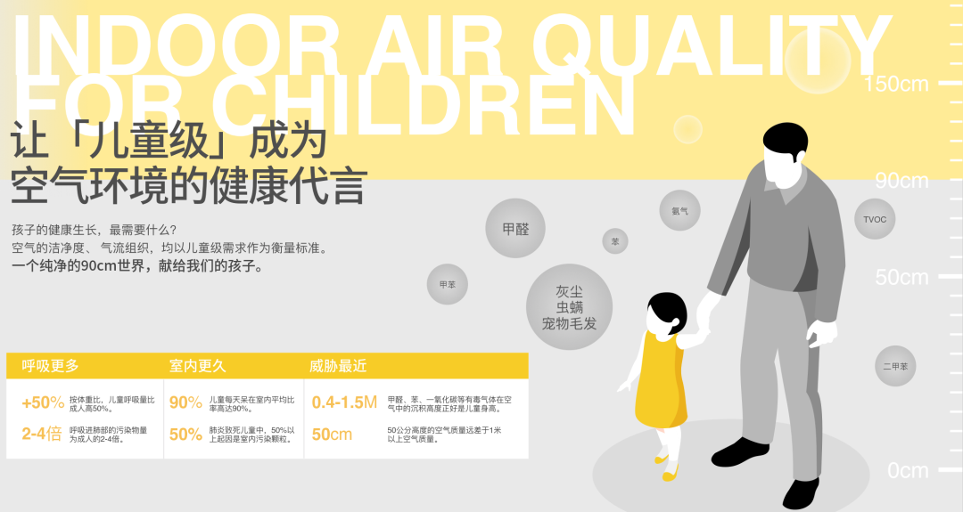 大多数污染物的悬浮高度在40-150厘米内,这正好是孩子的身体高度,中海希望通过气流组织、净化,解决这一盲区,呵护孩子的健康。